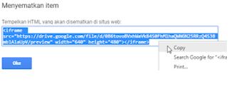 Setelah klik “Menyematkan item“, maka akan muncul kotak dialog yang berisi kode html. Blog kode tersebut kemudian – klik kanan – menyalin.